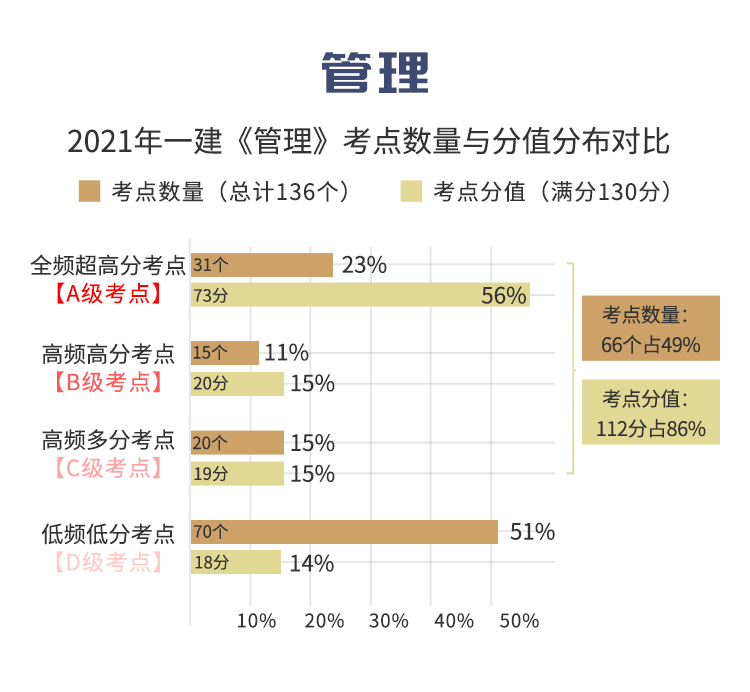 部分实务科目的考点较为分散,所以A、B级考点较少,但即便如此,A、B级考点总分值依然能达到81-131分,非常可观!对于通过考试,这些分值,可谓不得不拿!